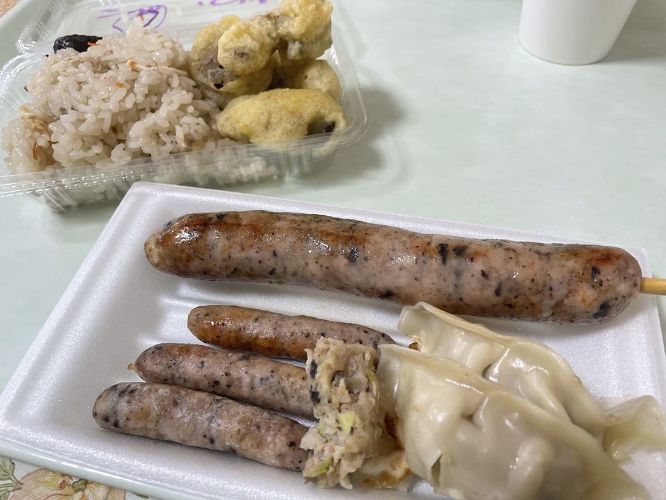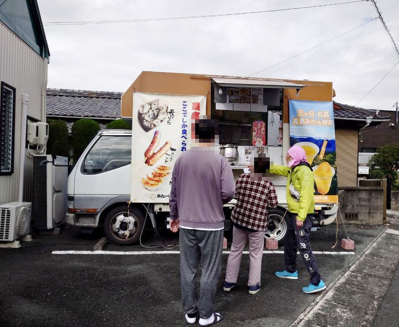 『キッチンカー』 令和7年3月26日(水)そらまめに浜松きのこのキッチンカーが来ました。浜松きの こ入りの餃子やフランク、炊き込みご飯、天ぷら、アイスクリームやジュースな ど、とても美味しそうに笑顔で食べていました。キッチンカーの中にいる理事長 にも興味津々な様子でした。