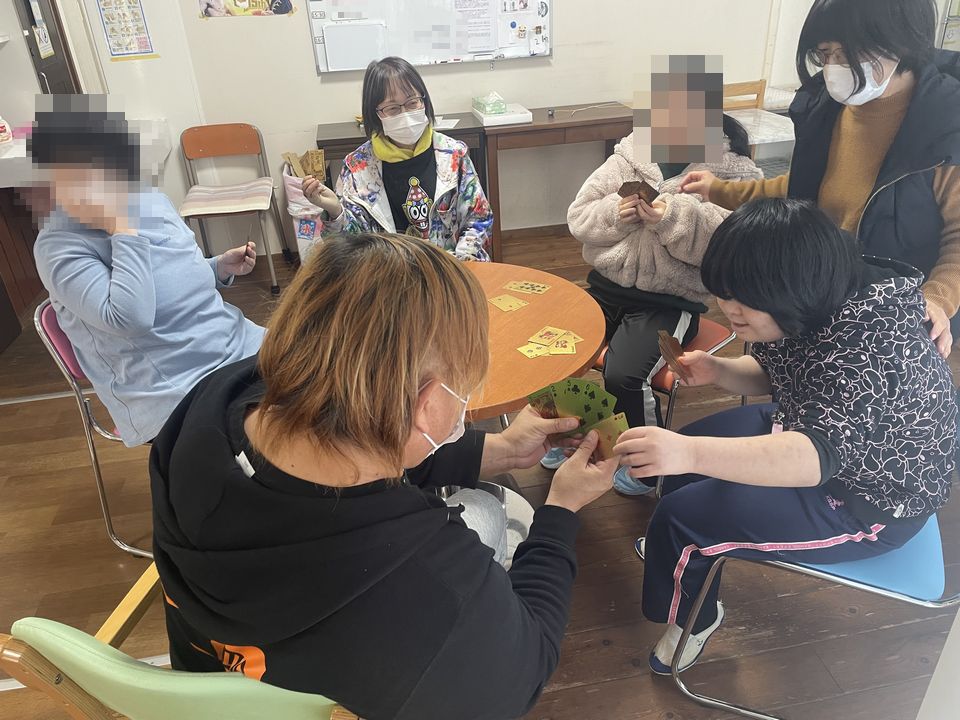 『チームでら高井選手』 令和7年11月18日(火)チームでら所属の高井憲吾選手が訪問され、ババ抜き最弱王決定 戦を開催しました。ゲームで楽しんだ後は作業を手伝ってもらい、おやつを一緒に食べ たりと笑いいっぱいの楽しい時間を過ごしました。